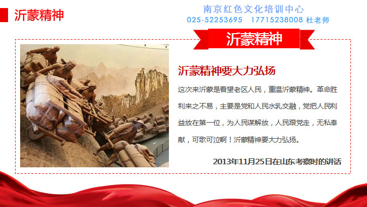 习近平在会见“沂蒙母亲”王换于孙女于爱梅等模范人物时表示,革命胜利来之不易,主要是党和人民水乳交融,党把人民利益放在第一位,为人民谋解放,人民跟党走,无私奉献,可歌可泣,沂蒙精神要大力弘扬。随后,习近平来到临沭县曹庄镇朱村“老支前”王克昌家看望。一家人干农活做柳编,日子“基本奔小康”。习近平说,我们这一代、下一代都要沿着CN特色社会主义道路向前,让老区人民生活得更幸福。 革命教育